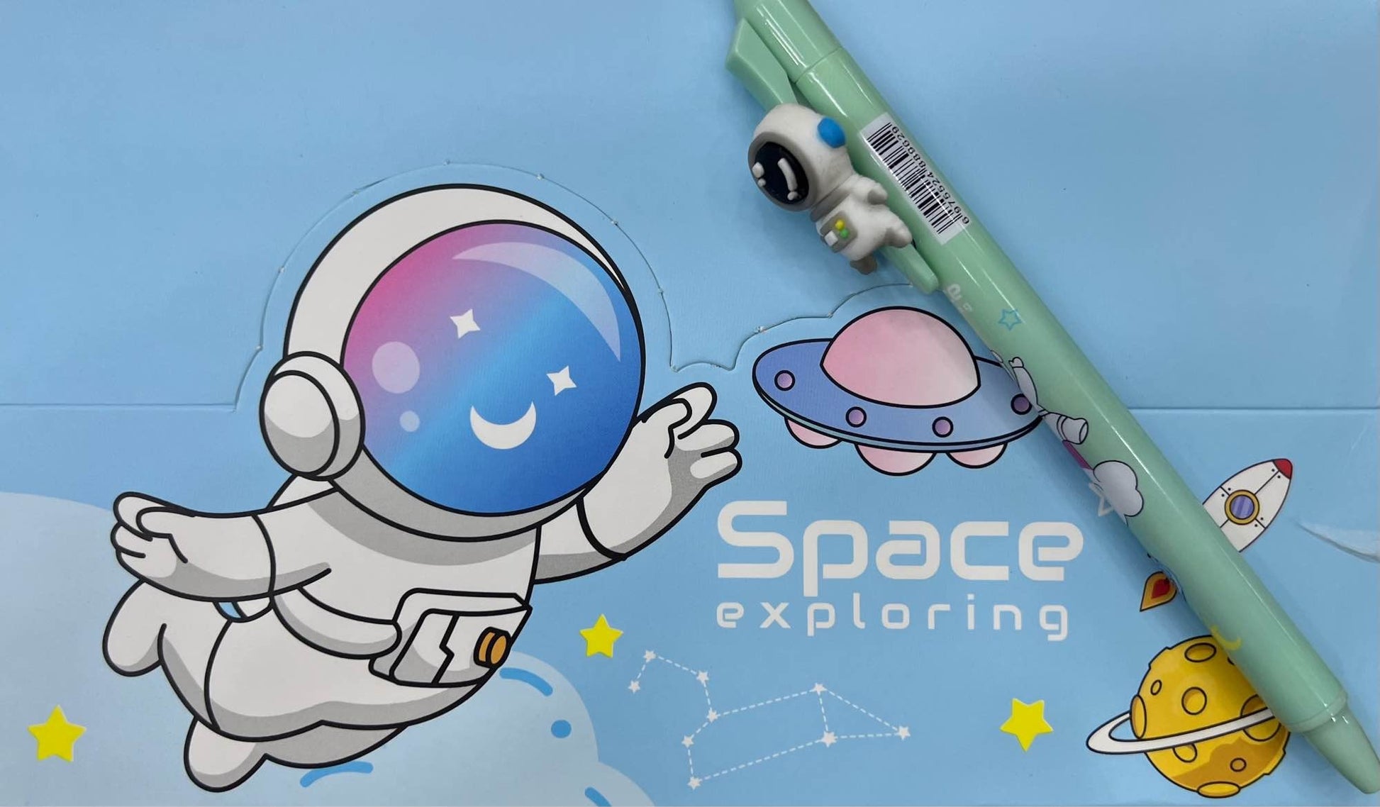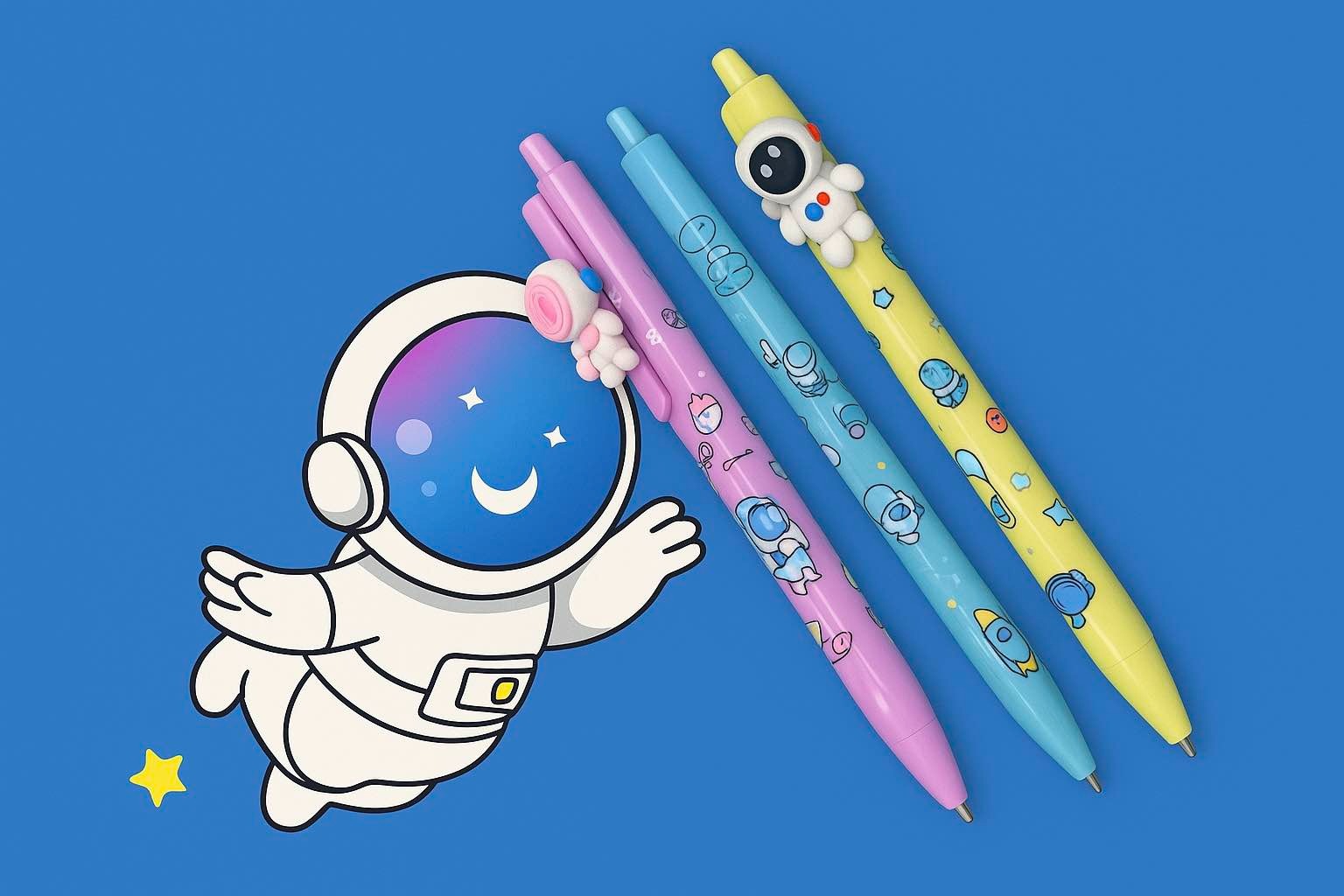 “Cute astronaut-themed pen with vibrant space designs and a handy eraser on top – perfect for writing, doodling, and correcting in style!”